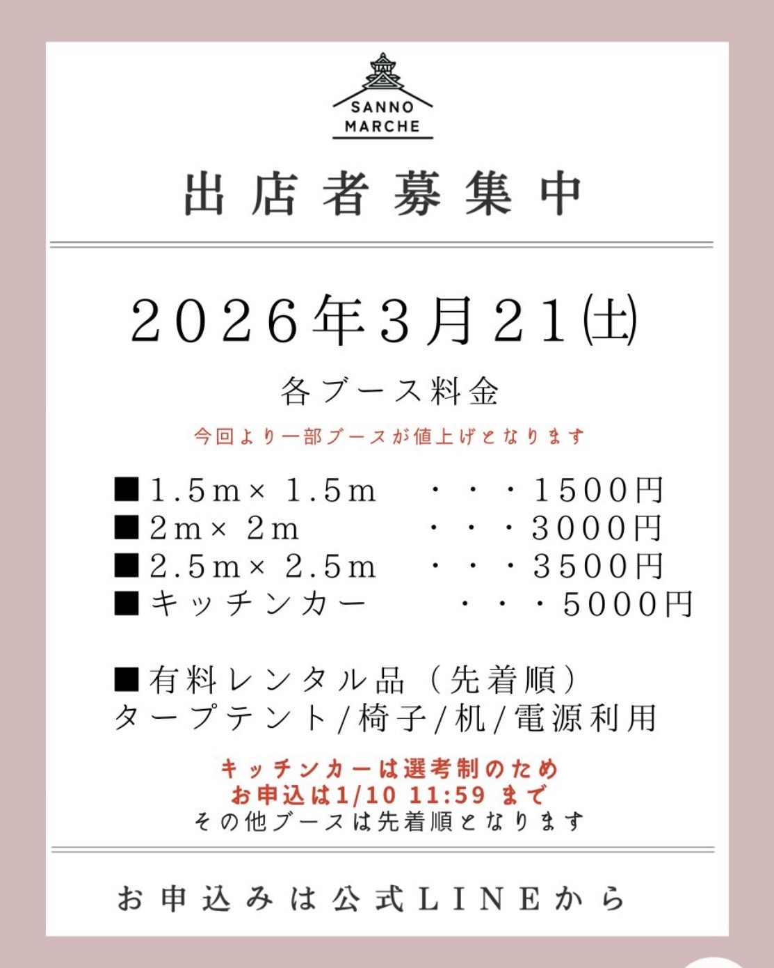 3月以降の出店募集はサンノマルシェInstagramに詳しく記載がございます!Instagramに公式LINEがを掲載してますので、エントリーお待ちしてます