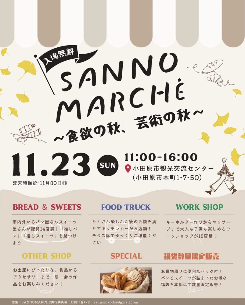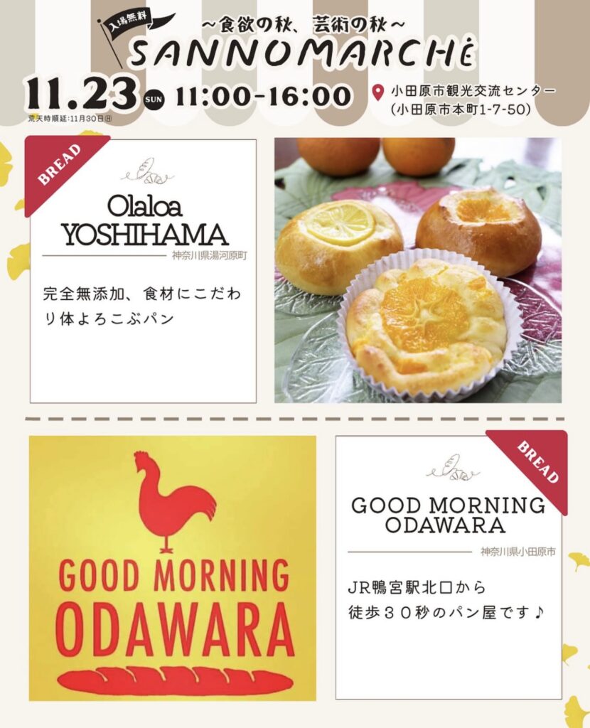 次回▶︎11/23.12/7.12/14.2026/1/25 小田原城まで徒歩30秒。小田原市観光交流センターにて毎月不定日開催。美味しいものからクラフト品まで楽しめる、ふらっとよれるマルシェです。出店に関するお問い合わせ及び申込はこちら↓