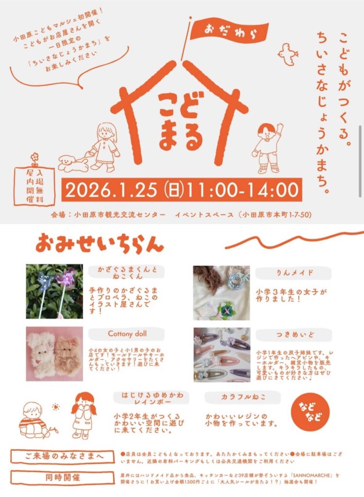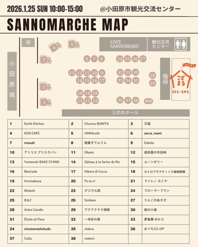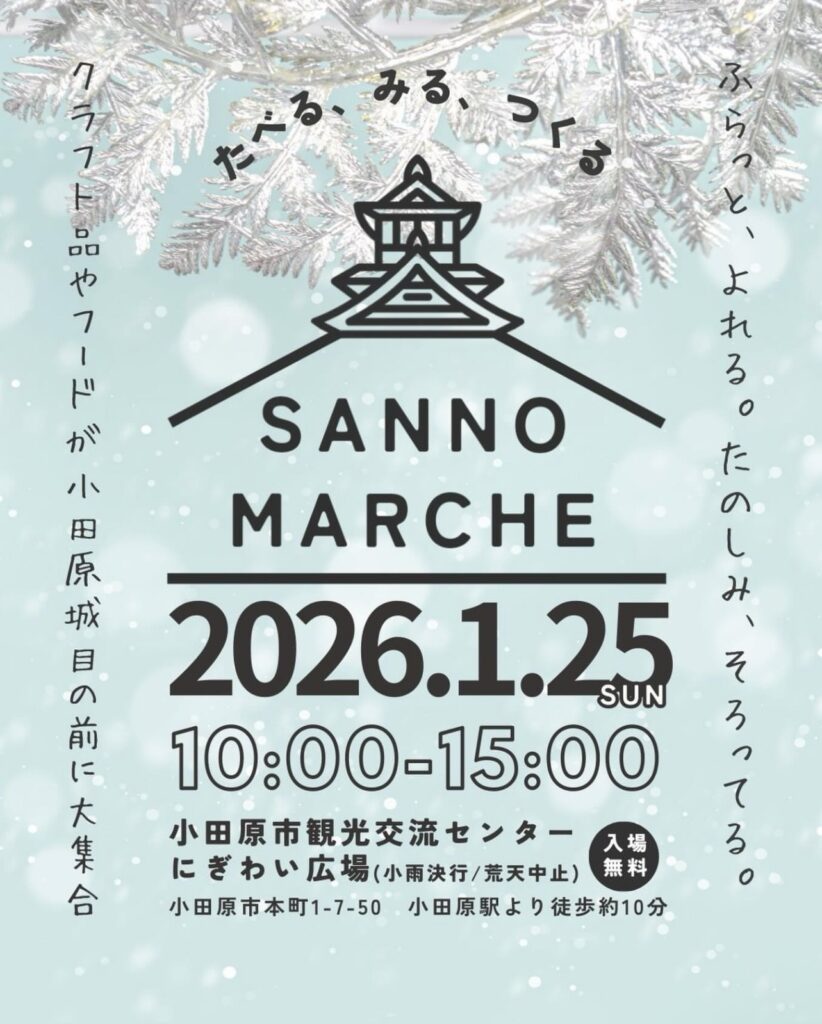 次回▶︎2026/1/25.3/21 小田原城まで徒歩30秒。小田原市観光交流センターにて毎月不定日開催。美味しいものからクラフト品まで楽しめる、ふらっとよれるマルシェです。出店に関するお問い合わせ及び申込はこちら↓